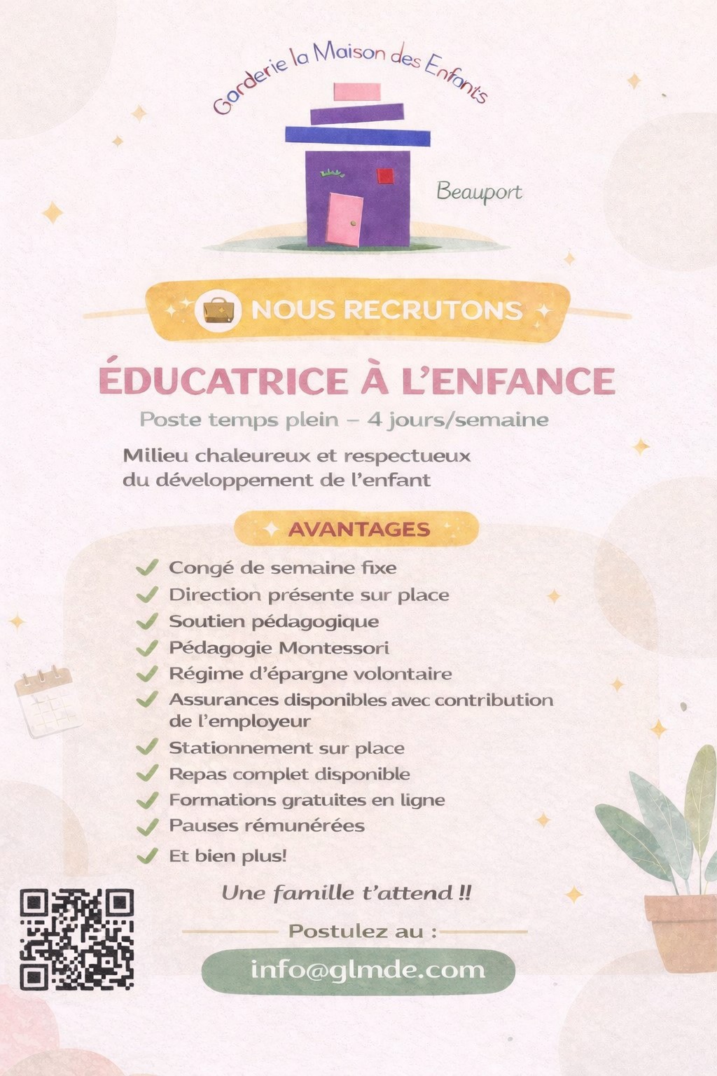 Veiller à la santé, la sécurité et le bien-être des enfants. Accompagner et soutenir l’éducatrice dans les activités éducatives. Participer à l’organisation et à l’entretien des lieux et du matériel.